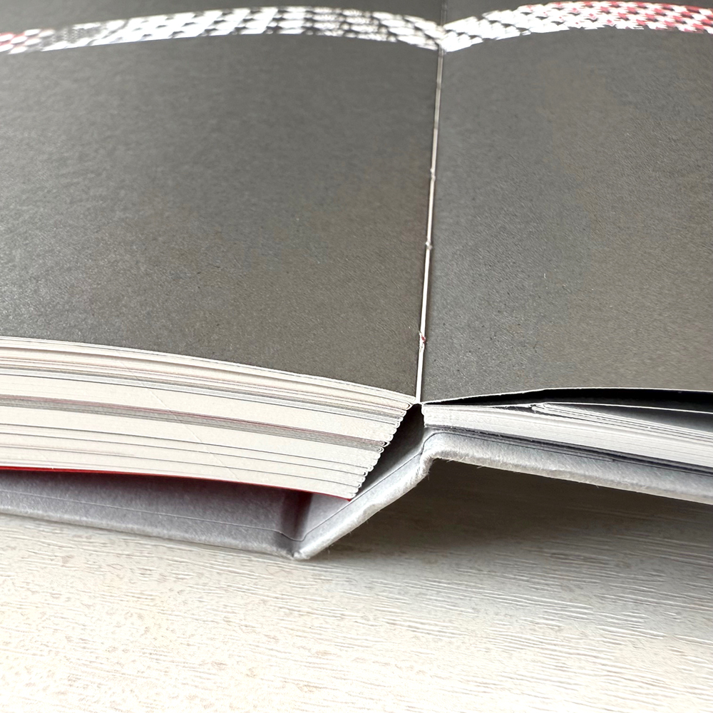 スイス装は、本体を裏表紙だけに糊付けする製本方法です。閉じているときは上製本のように見えますが、開くと表紙はフラットに開き、本体の背とは接着されていません。