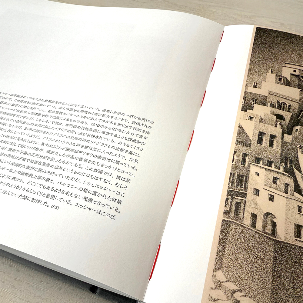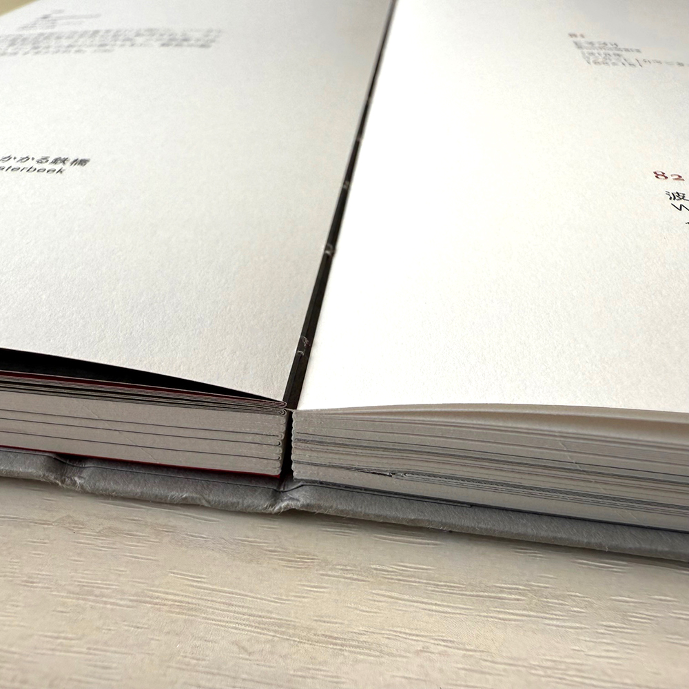 本文を糸かがりで綴じ、背には薄く糊を塗って固めます。本の開きが良く、見開きのまま閉じずに読むことができるため、写真やイラストを2ページにわたって大きく見せたい場合にも最適です。表紙に厚い板紙を用いたり、見返しを付けたり、その上にカバーや帯を重ねることも可能です。