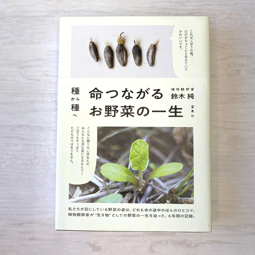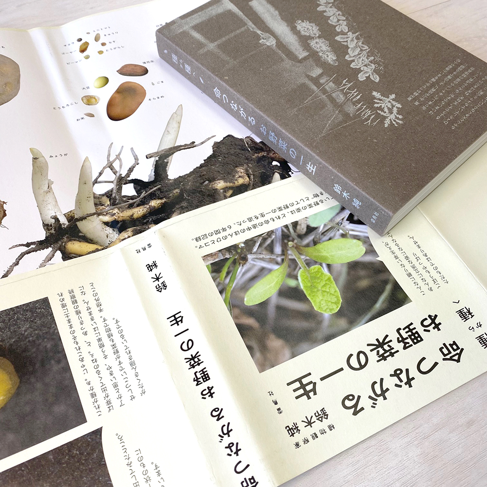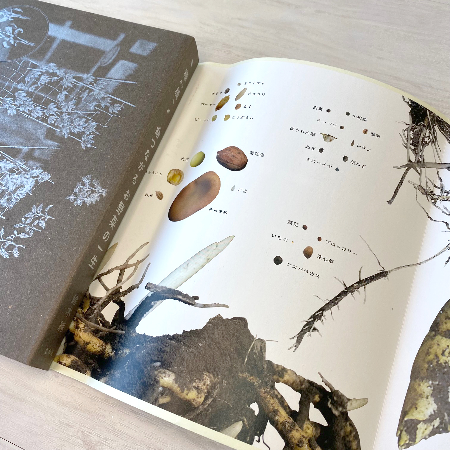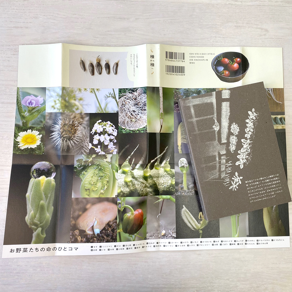カバーを外して広げると、表面と裏面いっぱいに、種や野菜の成長の一場面を切り取った写真が印刷されています。さらに、紙の上下を折り込むことで紙面を広く使えるようになっており、その折り込み部分はまるで帯のようにも見えるデザインになっています。手間をかけた、遊び心あふれる工夫です。