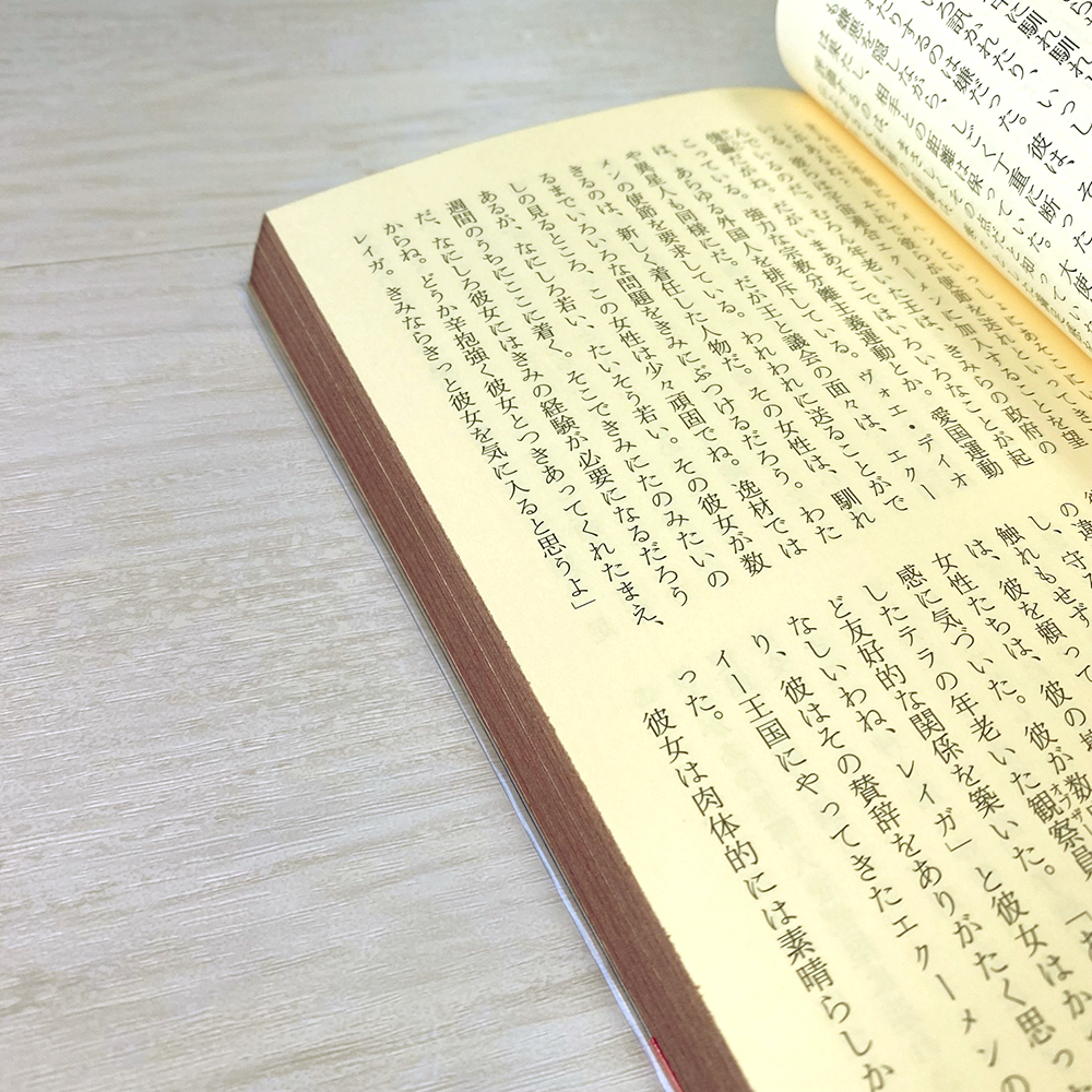 通常、小口は地の紙の色のままですが、色をつけることで本にひときわ目立つアクセントを加えることができます。加工方法には、断面に刷毛で塗料を塗る方法と、機械による自動塗装の方法があります。本文用紙には塗料を吸いやすい非塗工紙の書籍用紙や上質紙が使われることが多く、上製本にも並製本にも対応可能です。