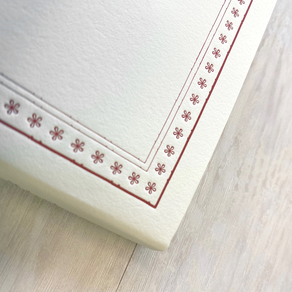 紙に残る凹みやインクのにじみにアナログ感が漂います。最大の魅力はその立体感で、紙の柔らかさまで感じられる仕上がりになります。そして何より、思わず触れてみたくなる表情に、心まで温かくなります。